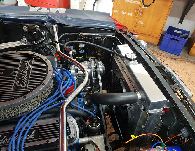 During our work, we found the radiator was leaking so we fitted an aluminium radiator. We had to remove the direct drive fan, hand-made an aluminium fan shroud and fitted an electric fan to improve engine cooling and help deal with the extra heat load from having air-conditioning. Then we rewired the air-conditioning and fan circuit to make it all work.